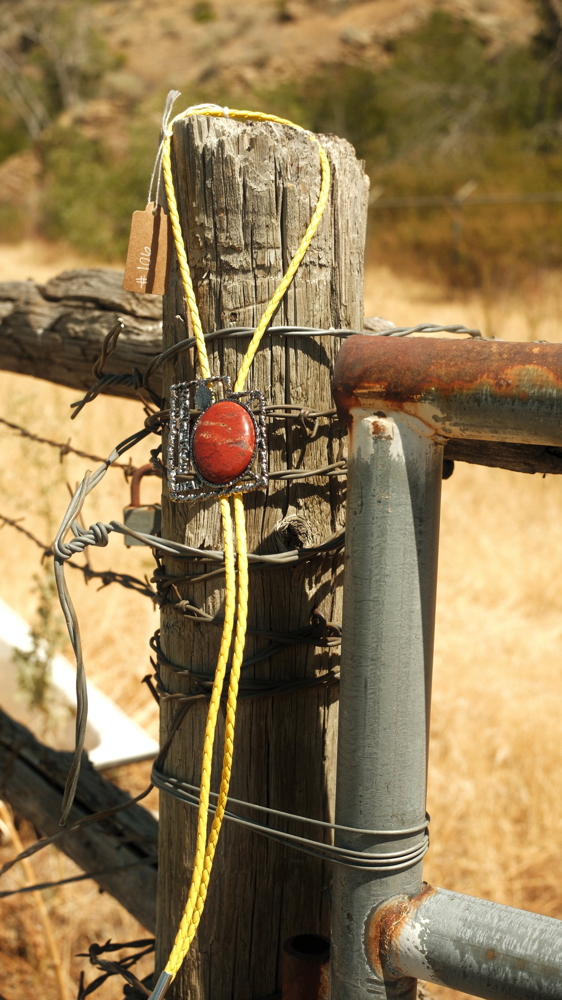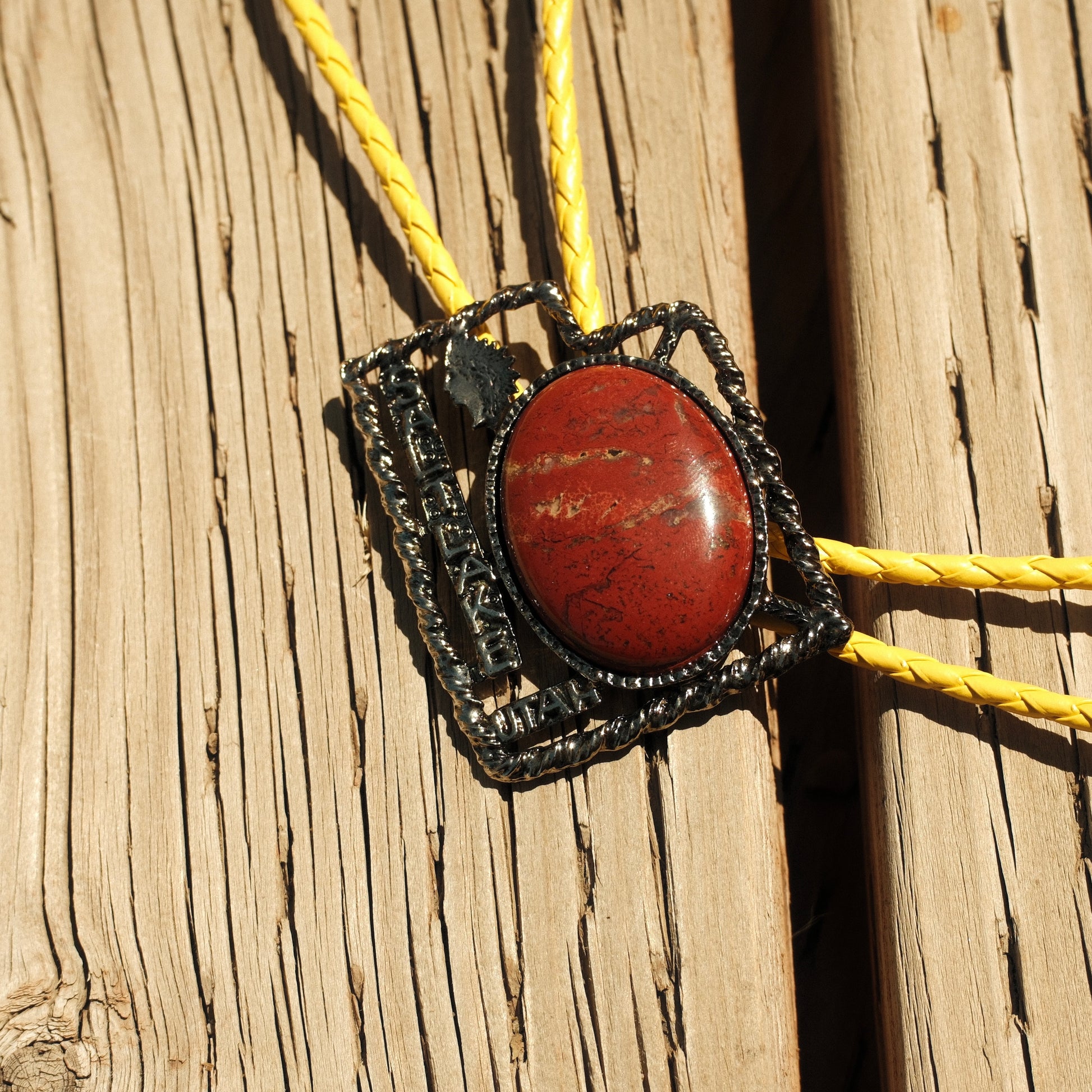 This bolo captures the glow of southern Utah’s red cliffs. A rich red river jasper cabochon sits inside a silver Utah-shaped slide, strung on bright yellow braided cords and finished with silver tips. Bold, bright, and full of desert warmth.