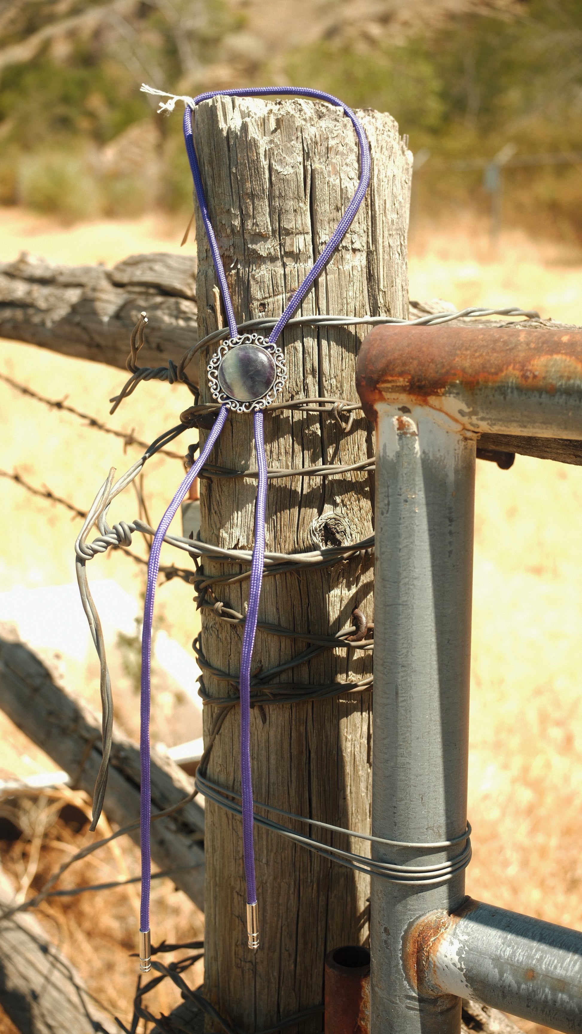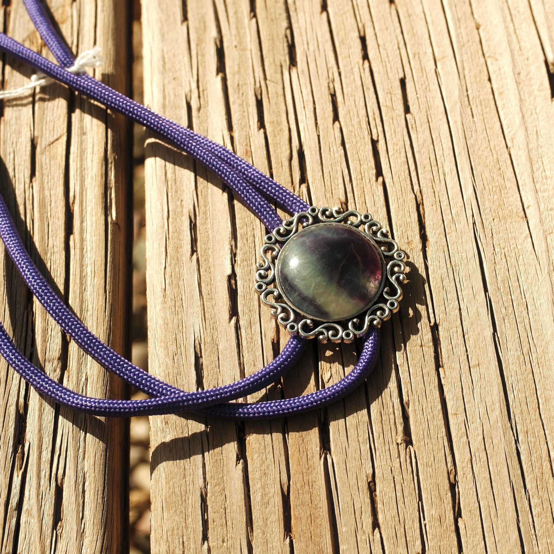 Like a desert night filled with falling stars. This bolo features a glowing rainbow fluorite cabochon, framed by an ornate silver setting, strung on purple paracord, and finished with silver tips. Ethereal and mysterious.