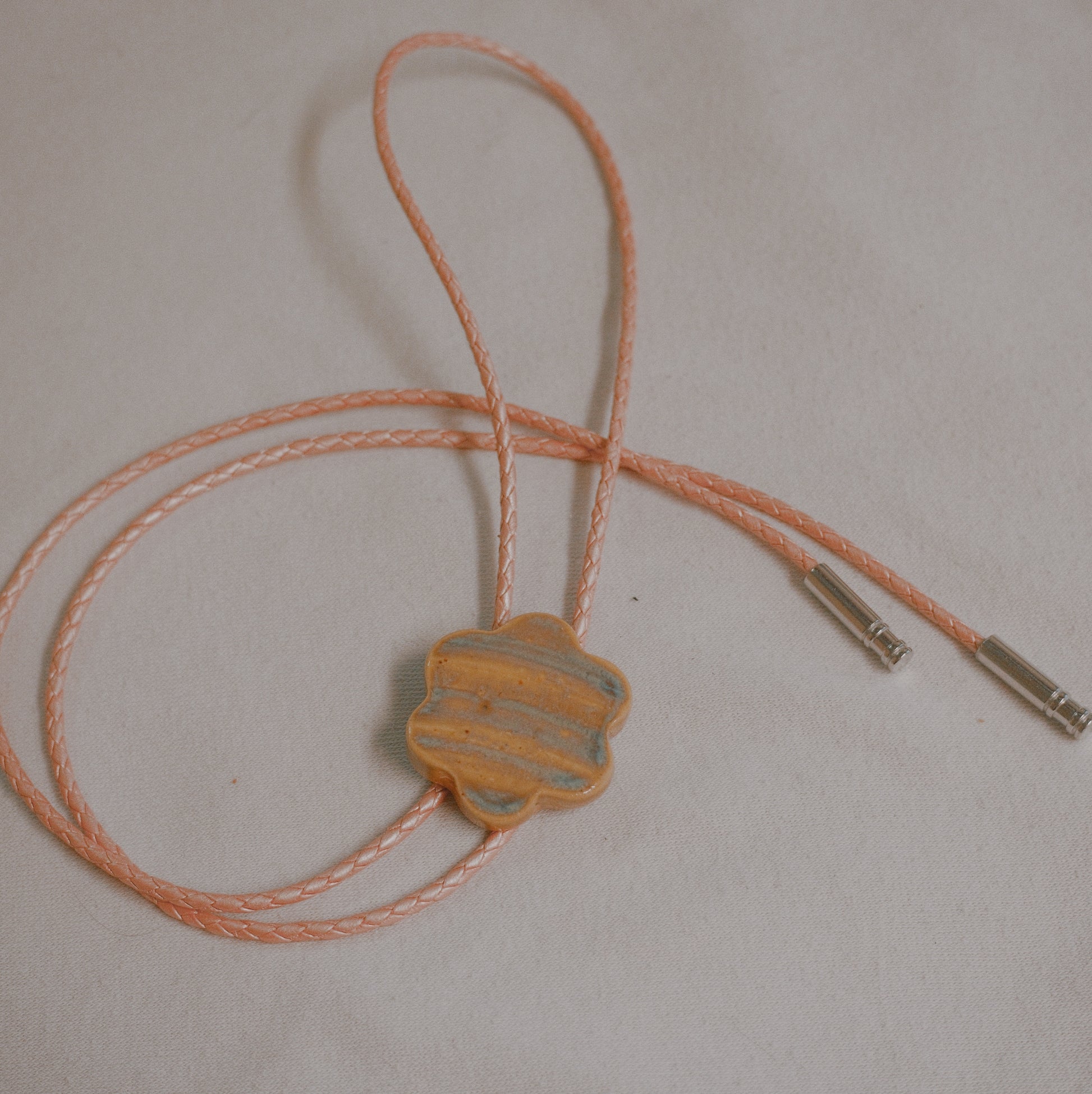A desert bloom with staying power. This bolo features a hand-thrown ceramic flower, soft pink with handmade texture, strung on pearly pink braided cords and finished with silver tips. Sweet but tough, fragile-looking but fierce.