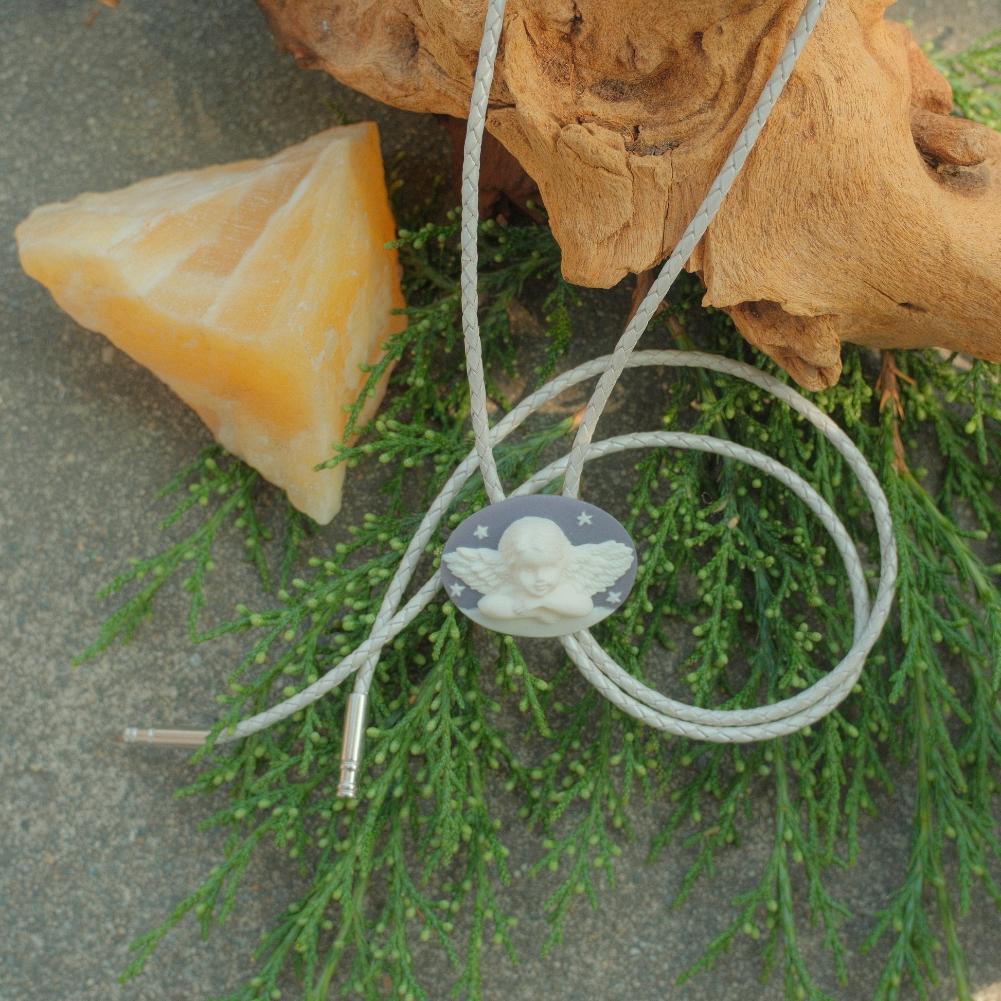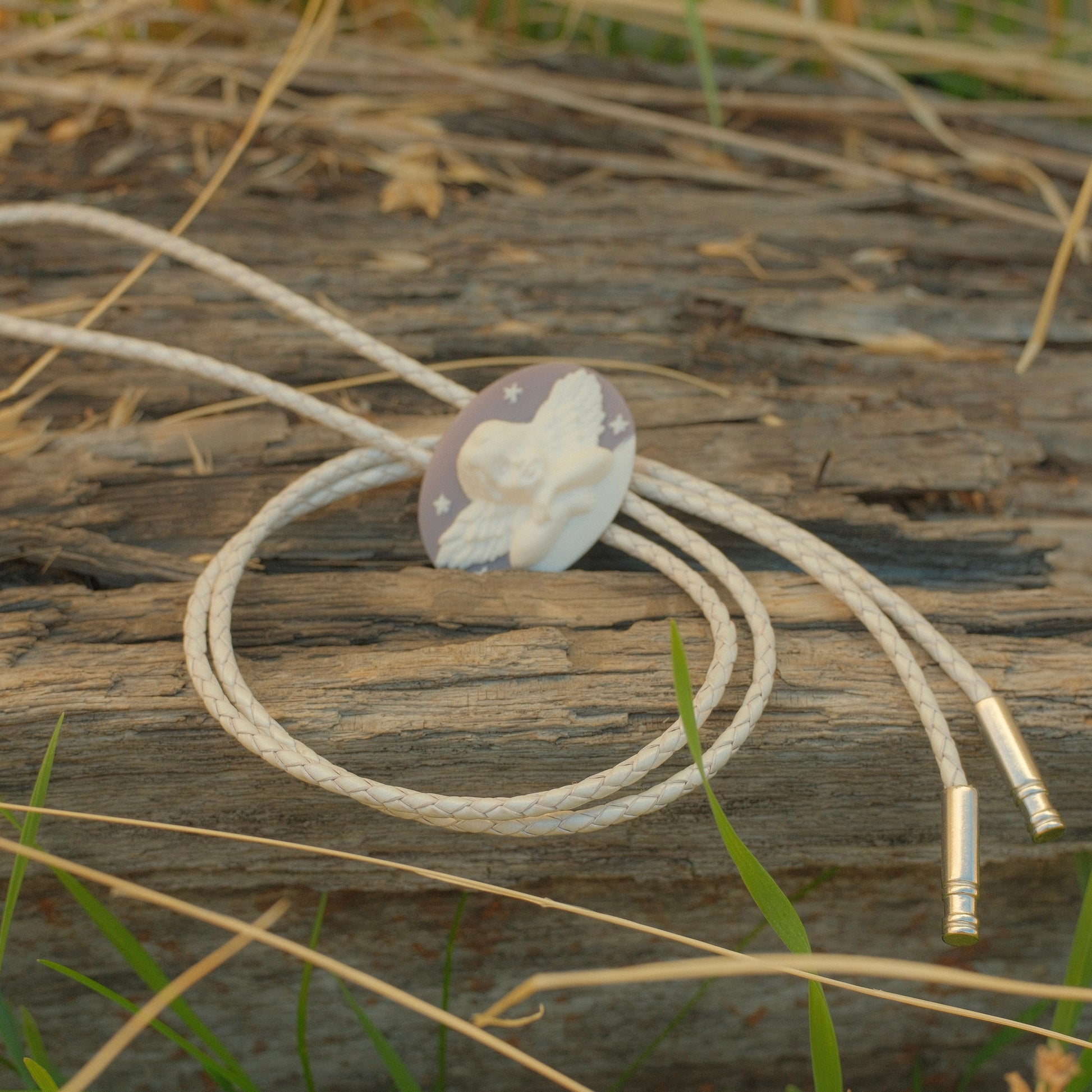 Not all angels behave. This bolo features a vintage 1940s cameo with a playful cherub on a purple background—half saint, half scoundrel. It’s strung on pearly white cords and finished with silver tips, balancing reverence with rebellion.