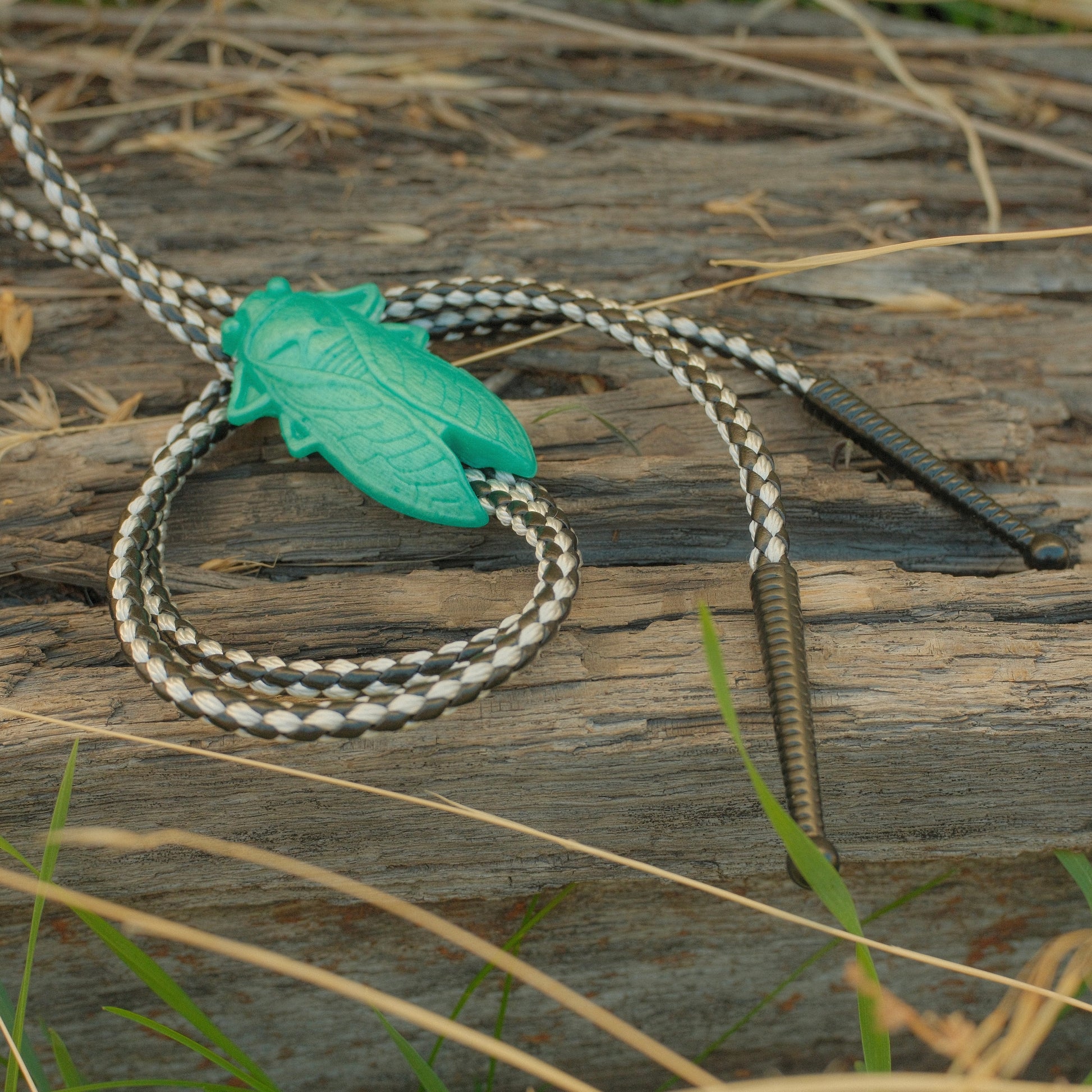 Buzzing with camp. This bolo features a teal resin cicada, glittering and strange, set on bold black-and-white harlequin cords with black tips. A little creepy, a little fabulous—pure outlaw energy.