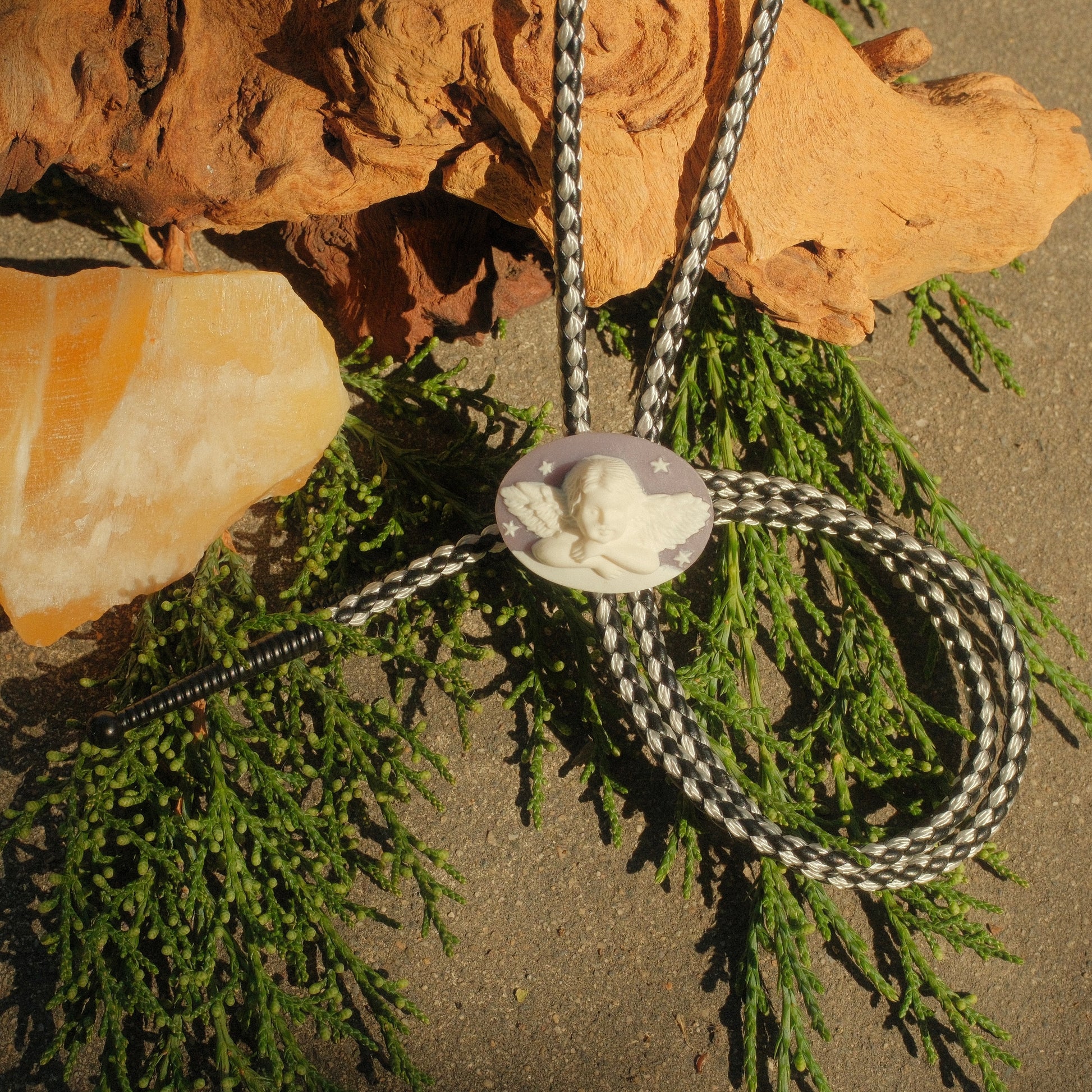 Not all angels wear white. This bolo features a purple vintage cameo, etched with a delicate angel design. Strung on black-and-white harlequin cords and finished with black tips, it’s celestial with a sharp edge.