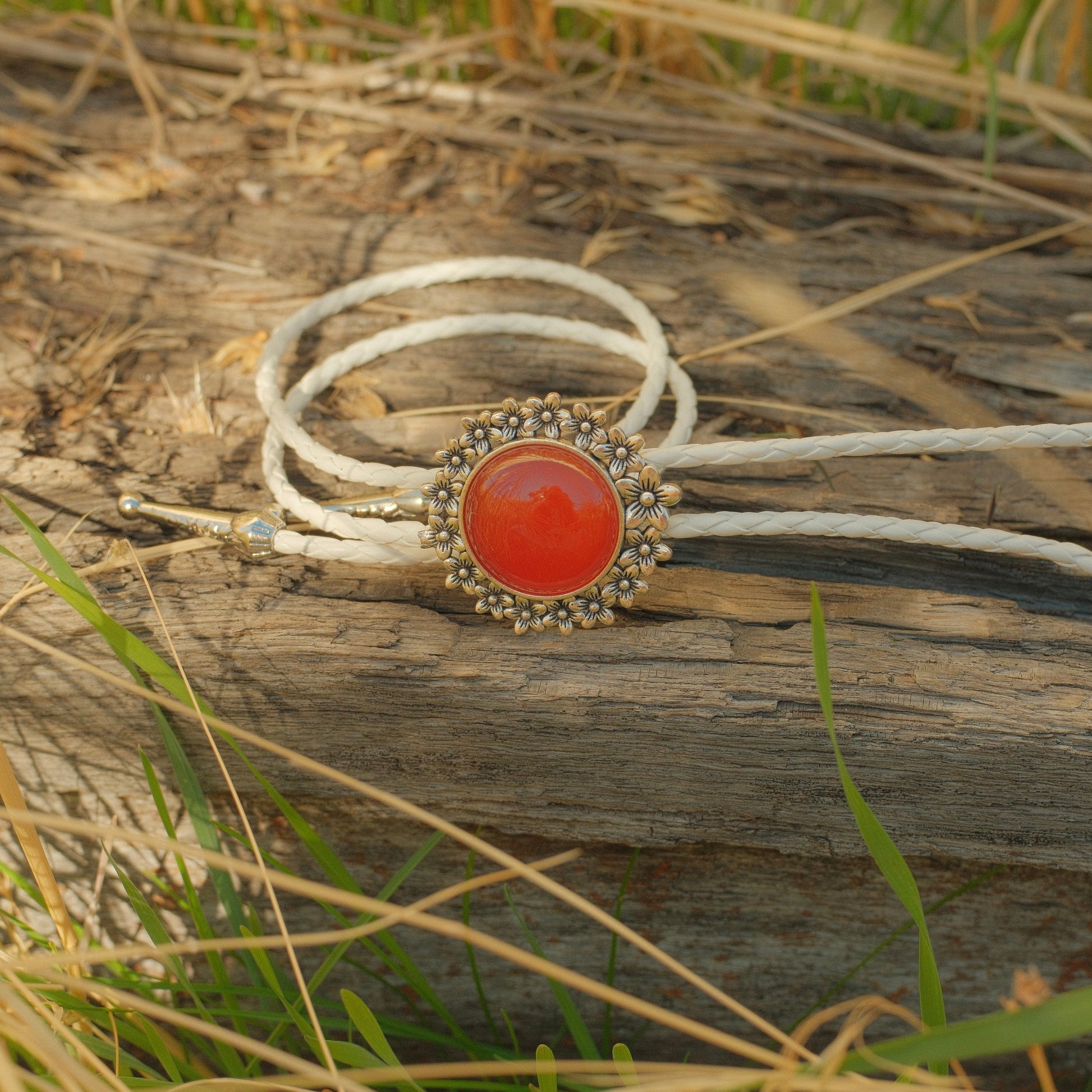 Bold yet tender, this bolo blooms from the dust. A rich red jasper cabochon sits in a detailed silver flower frame, strung on white braided leather cords and finished with silver tips. Grounded, radiant, and full of life.