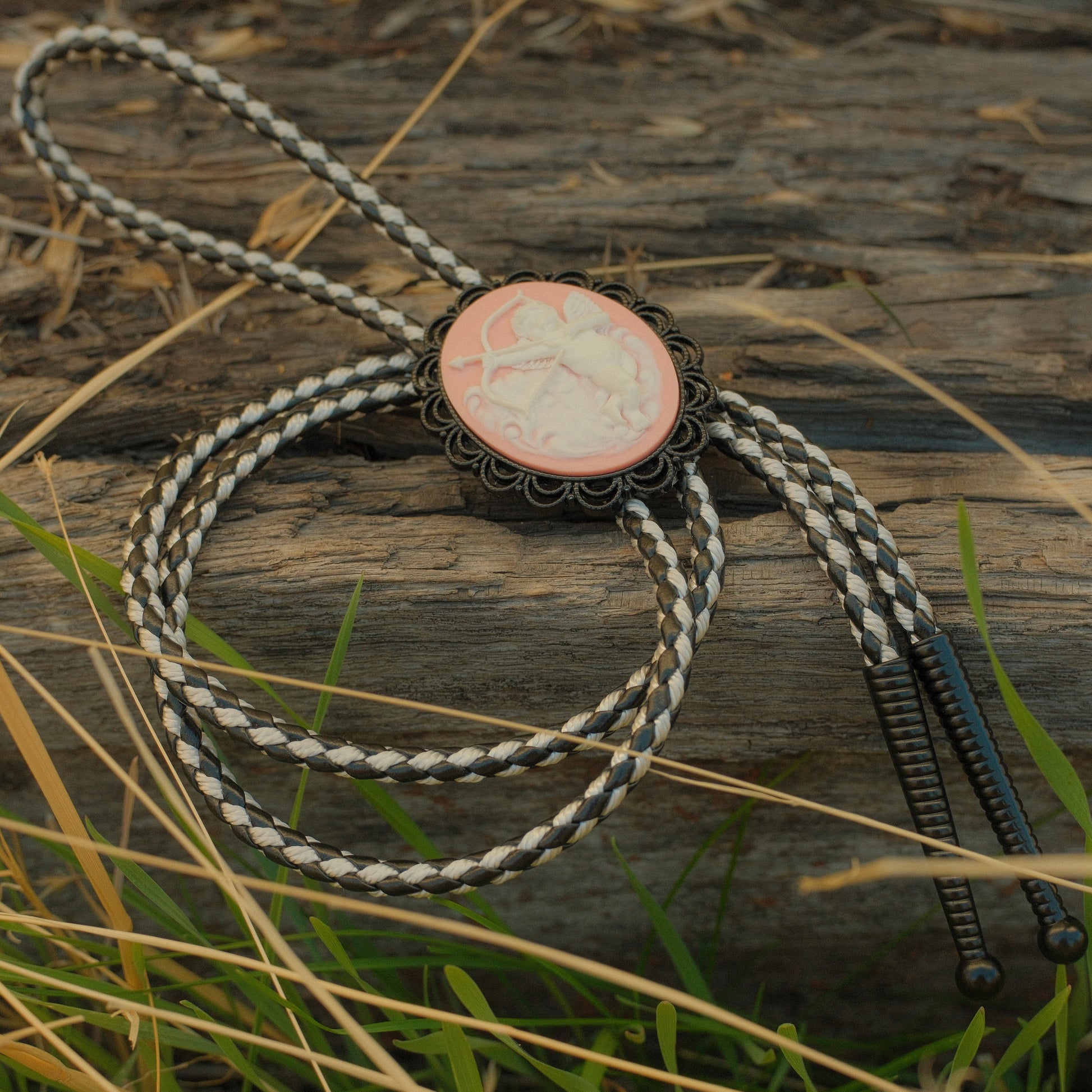 A piece of celestial camp. This bolo features a 1940s pink cherub cameo set in a black filigree frame, strung on black-and-white harlequin cords and finished with black tips. Sweet, spooky, and utterly divine.