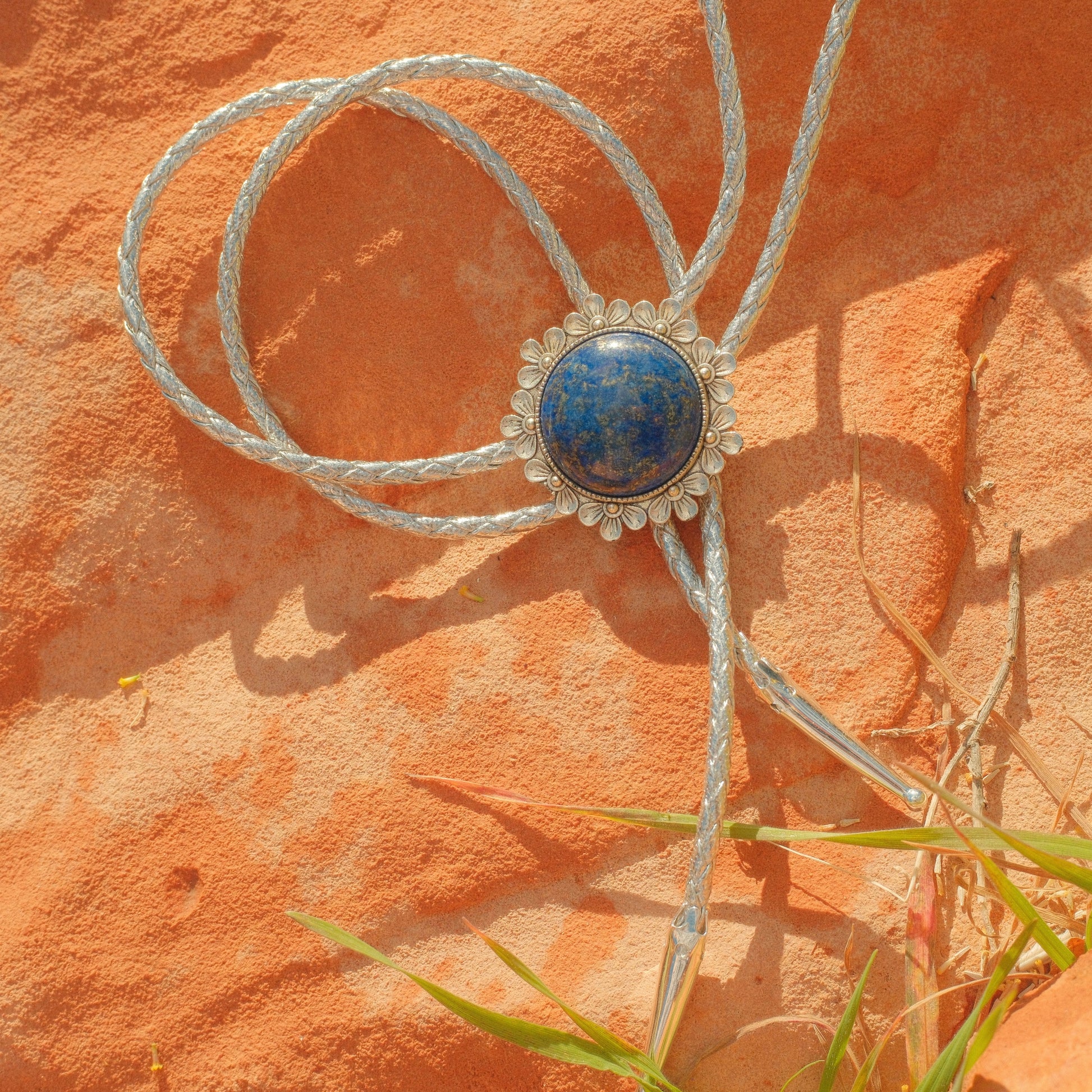 Deep blue stone framed in silver bloom. This bolo features a lapis lazuli cabochon set in a silver flower petal setting, paired with a silver faux leather cord and silver tips. Elegant, luminous, and quietly bold.