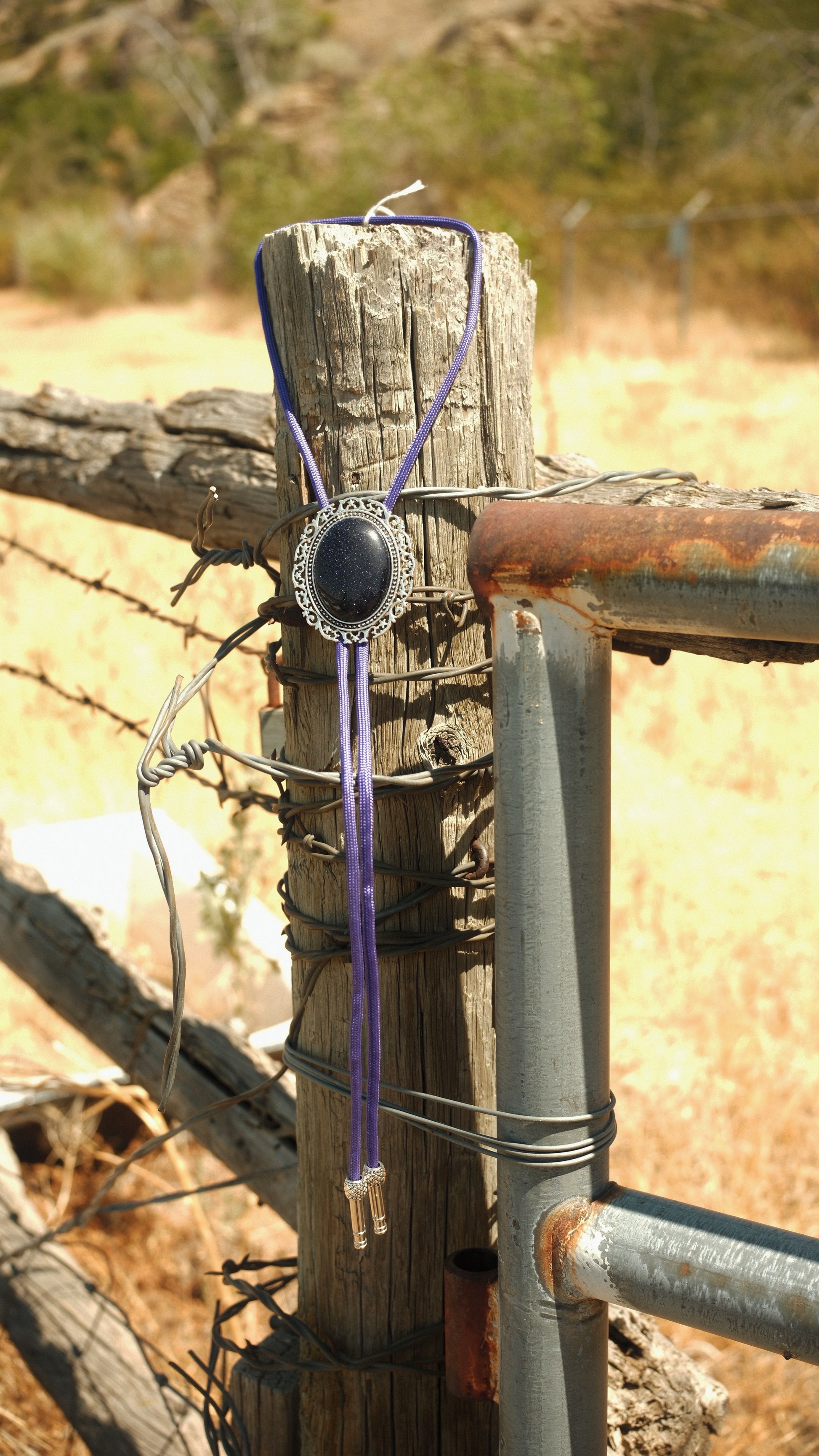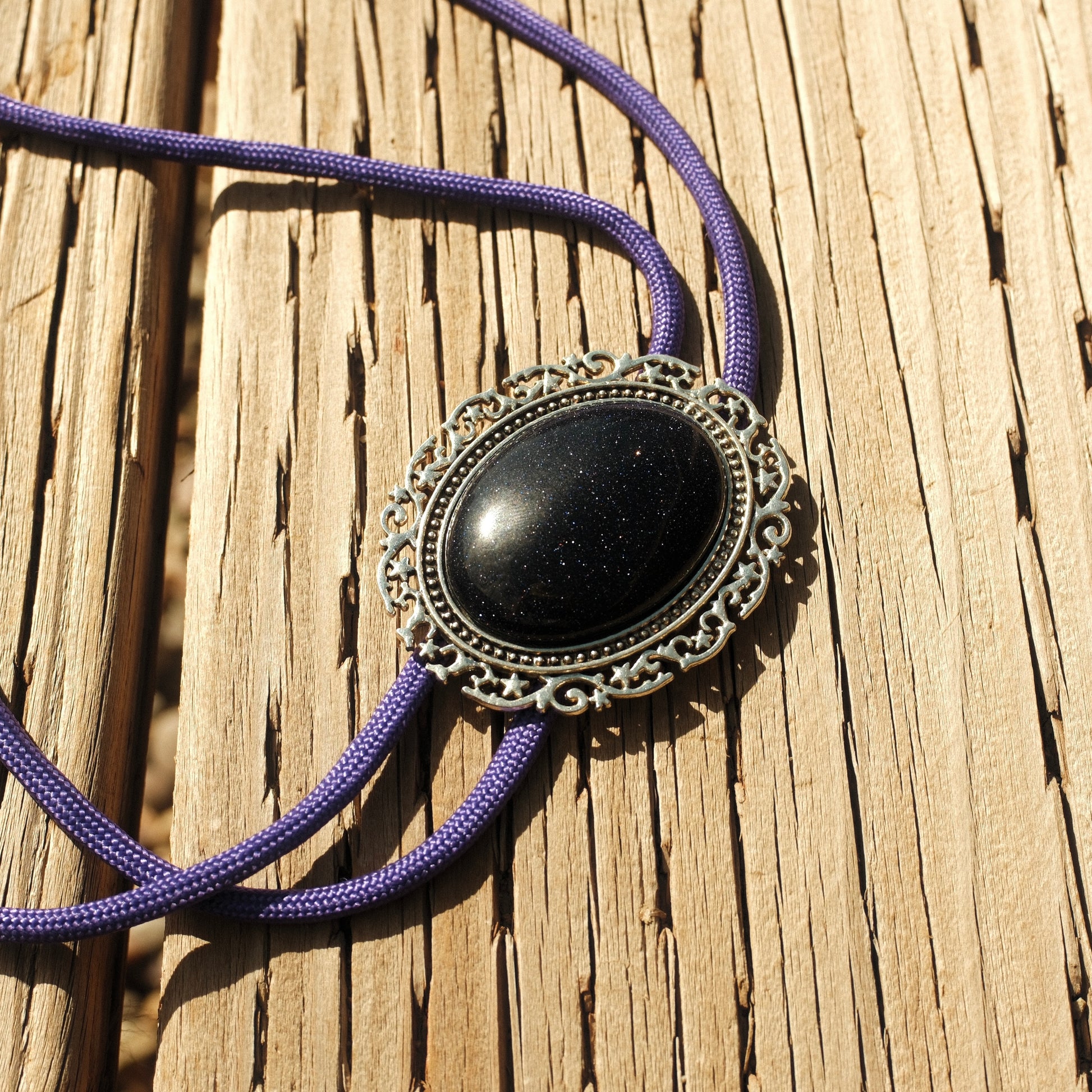 This shimmering purple goldstone flickers like stardust caught in stillness. Set in a silver filigree star frame and tied with violet cords, it’s as if the cosmos dressed up for a saloon ball.