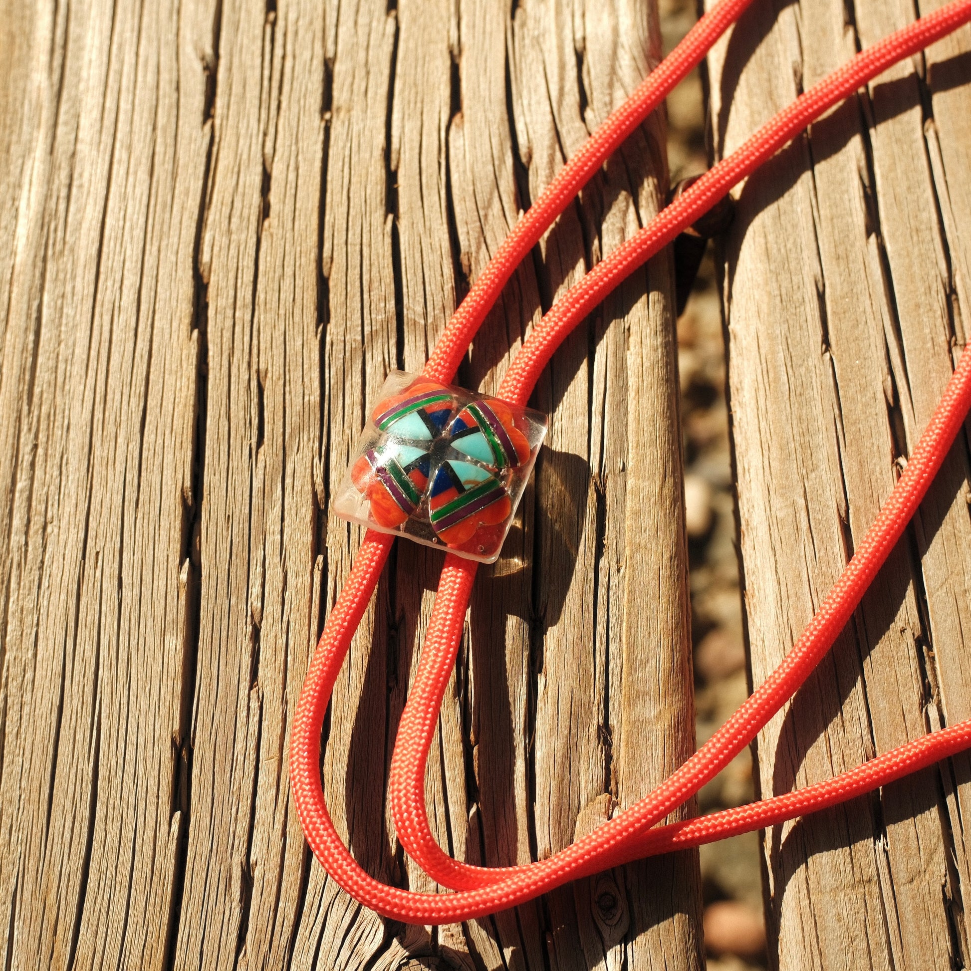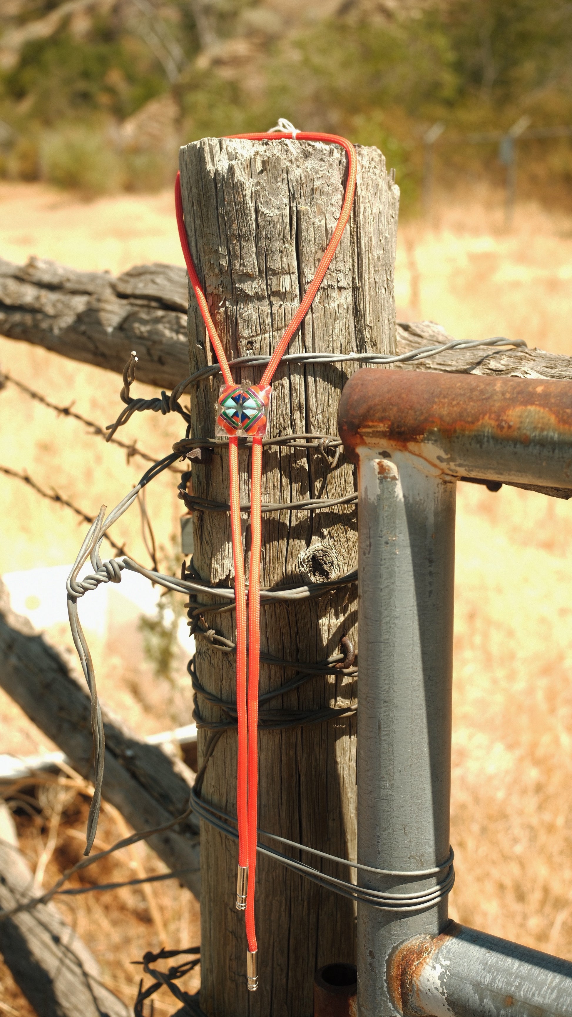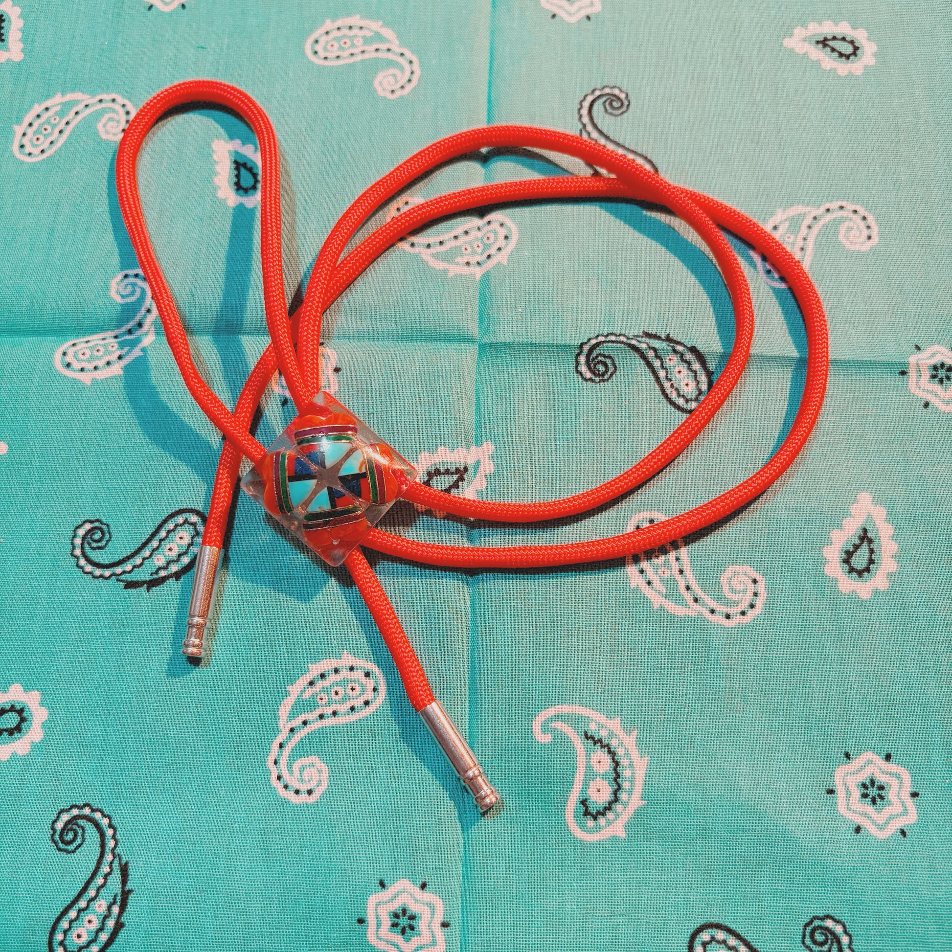 This bolo features 4 Southwest-style heart cabochons, made from tiny inlays of turquoise, lapis, malachite, and coral, arranged in a clover pattern and set in clear resin. It’s strung on a coral-colored nylon cord and finished with silver tips—a vibrant mix of color, memory, and movement.