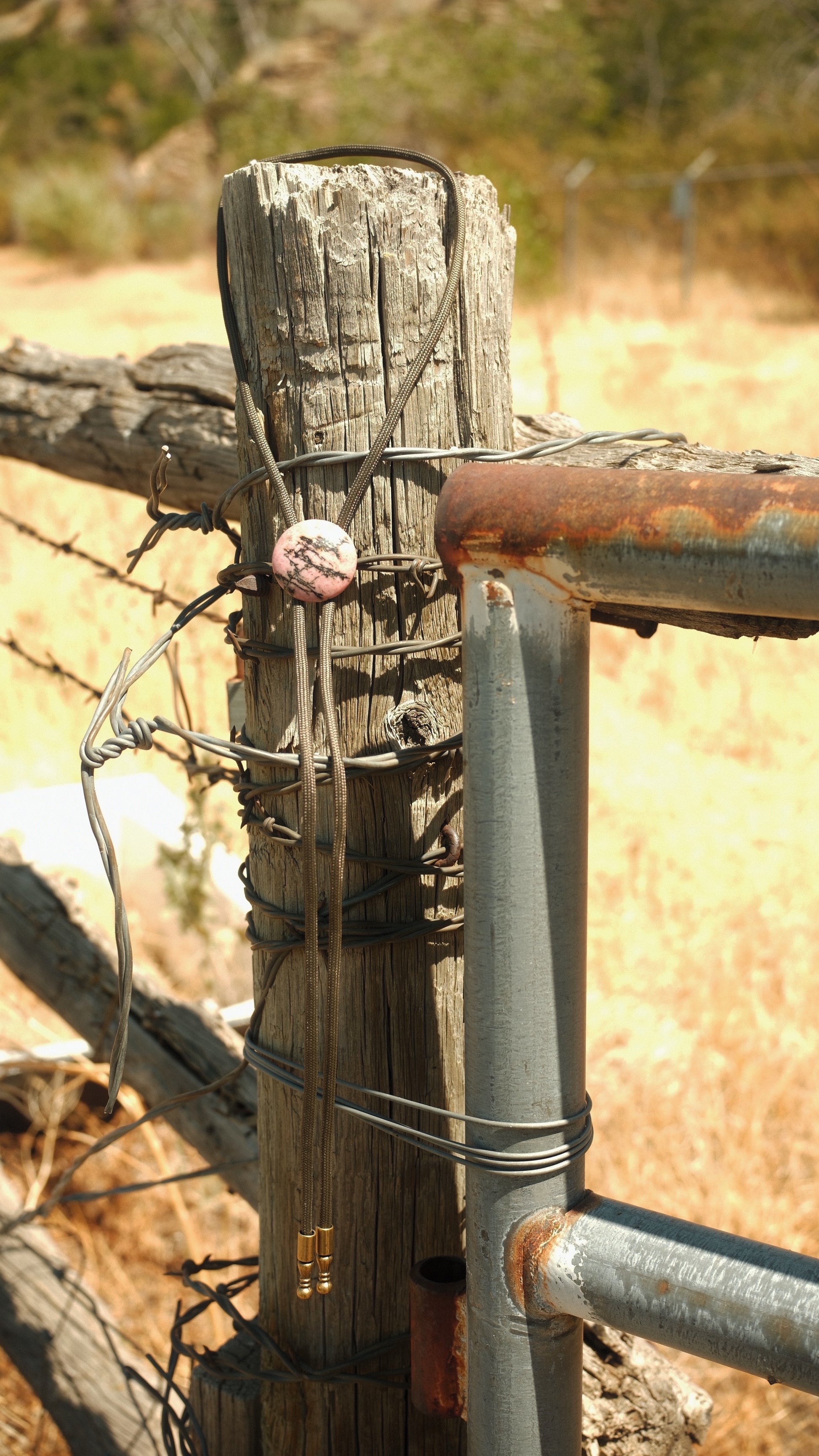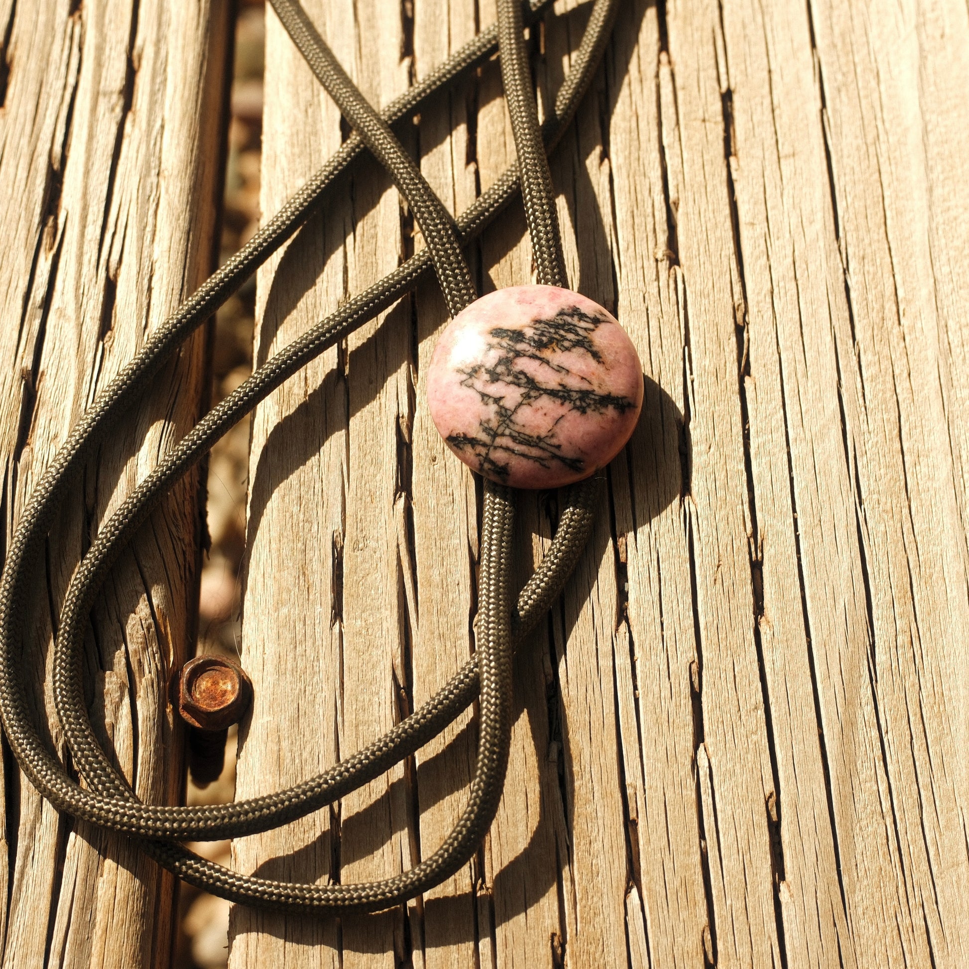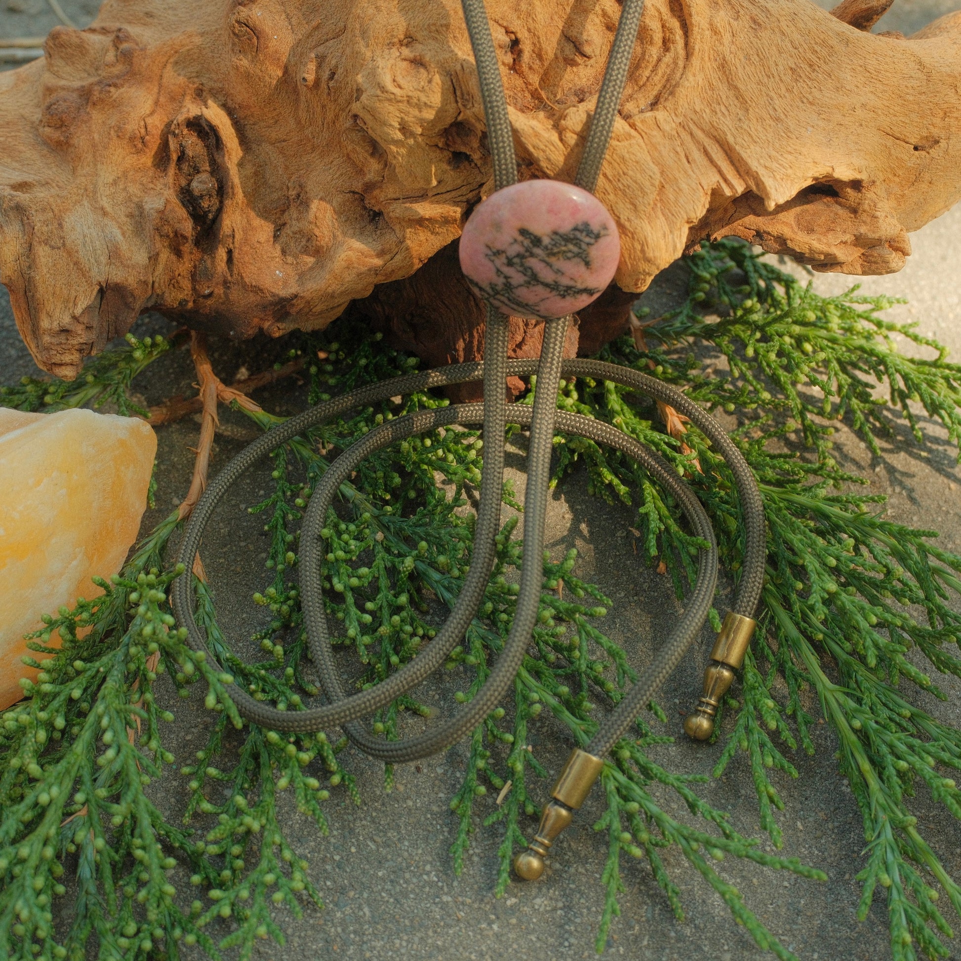 This bolo burns slow and steady. Featuring a matrix rhodonite cabochon, rich with black veins and pink warmth, it’s set simply and strung on olive green paracord with brass tips. Earthy, rugged, and full of quiet intensity.