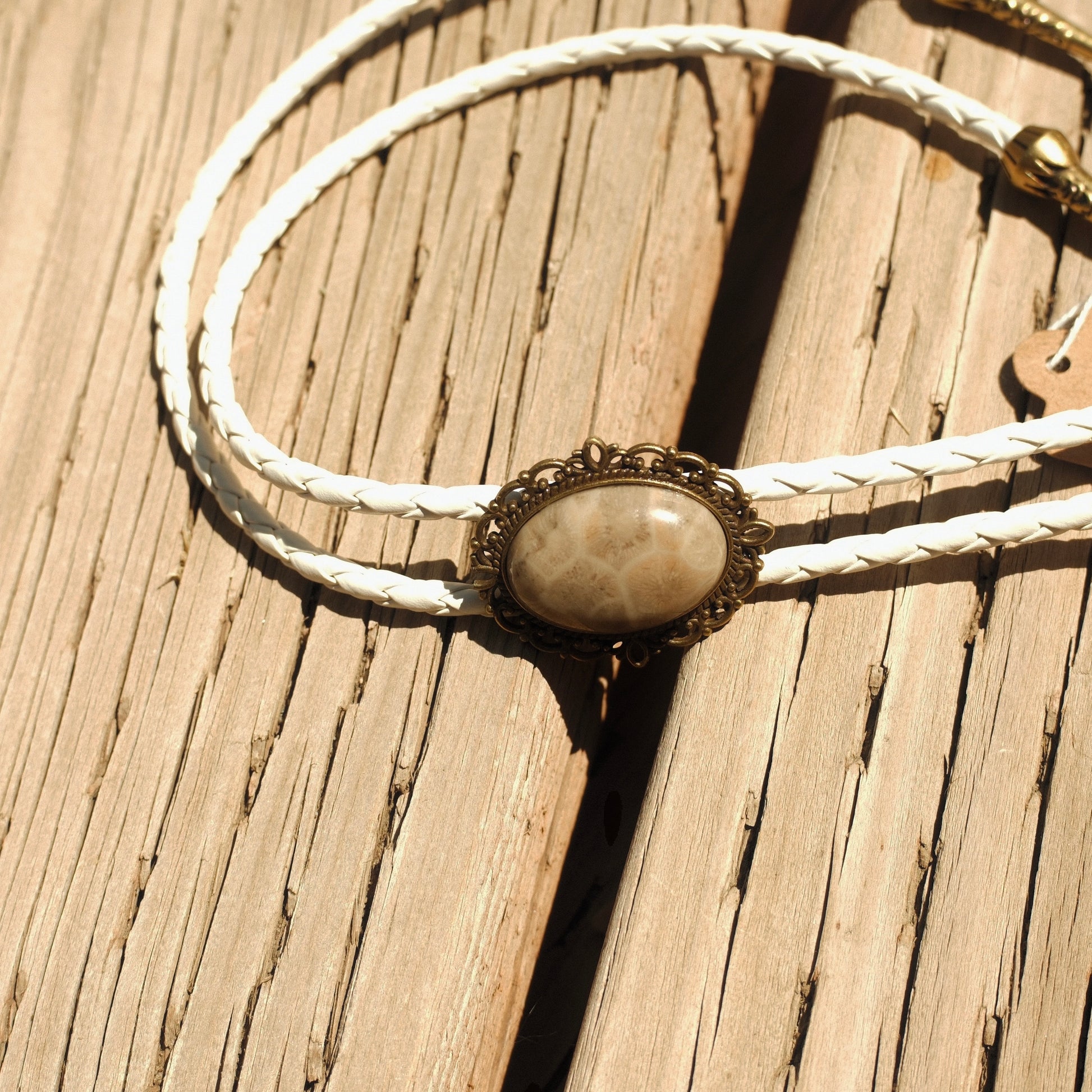 A bolo built from the bones of ancient oceans. This piece features a coral fossil cabochon, rich with natural textures, framed in an ornate brass filigree setting. It’s strung on white braided leather cords and finished with brass tips—a relic of the deep carried into the desert.