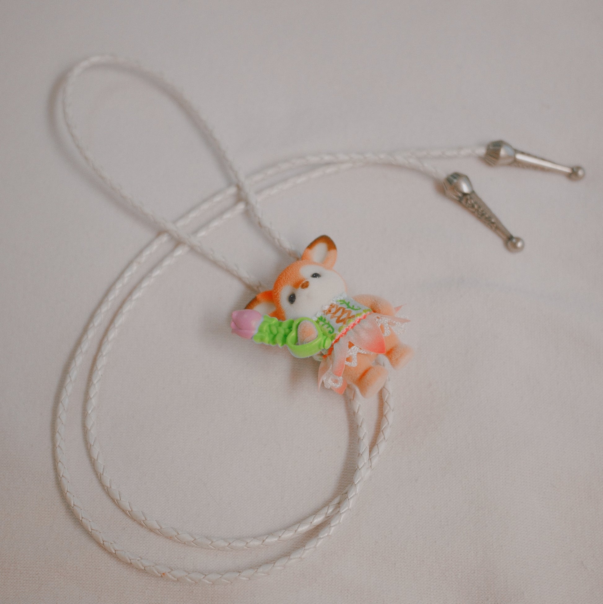 Tender and wild all at once. This bolo stars a Calico Critter deer, dressed in a fairy costume and carrying a tiny bouquet. Strung on pearly pink nylon cords and finished with silver tips, it’s soft, sweet, and pure camp charm.