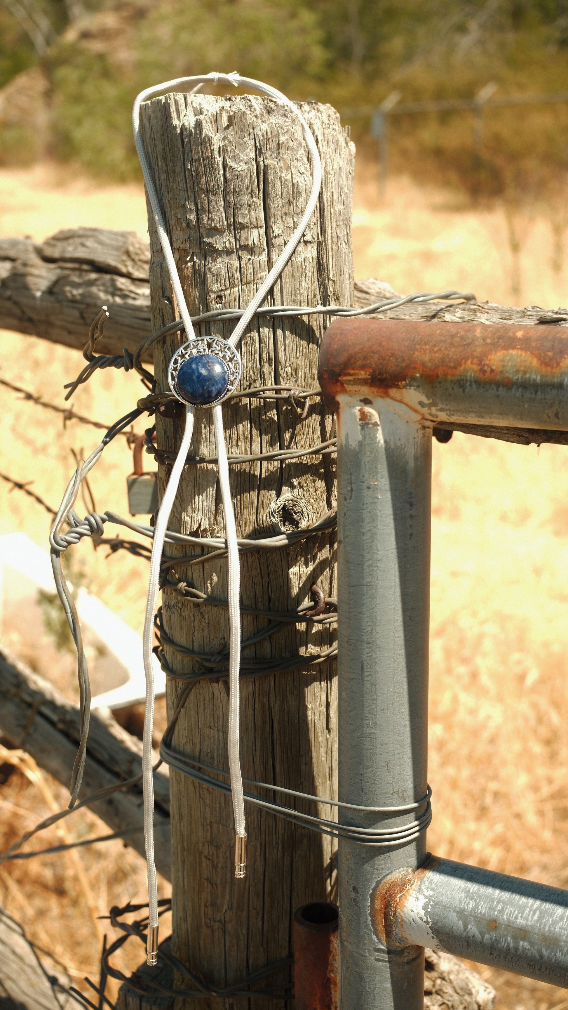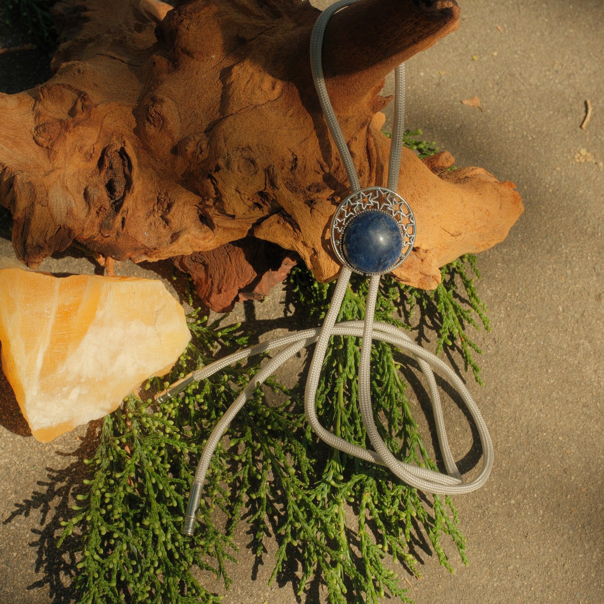 This bolo features a deep blue sodalite cabochon, streaked with whispers of white like a night sky on the edge of a storm. It’s set in a silver circle of stars—because sometimes, cowboys wish too. Strung on shimmering silver nylon cord and finished with silver tips, it’s subtle magic for your collarbones.